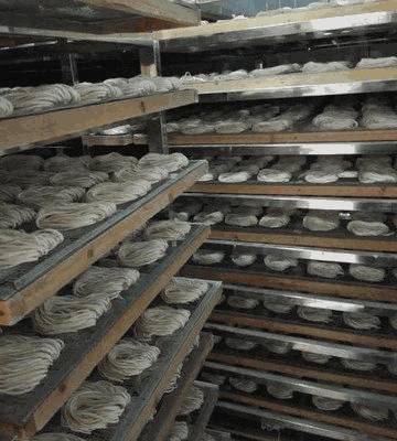一般常見的民間烘干法有自然烘干和機(jī)械烘干,民間的小工坊一般使用的是自然烘干,但,自然烘干往往有很多弊端,比如天氣方面的原因,天氣氣溫長時間上不來,這樣會導(dǎo)致面條的發(fā)霉,發(fā)臭等,另外還有人為方面的因素,比如長時間只是曬一面了,不翻曬,這樣也會導(dǎo)致面條受溫不均勻,面條的成色不好。