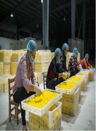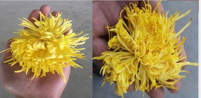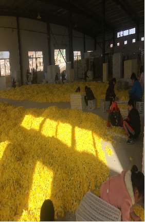 6、烘干出爐:烘干后的菊花在出庫以后看是否完全烘干干燥了,烘干干燥了的菊花,用手摸就會碎。