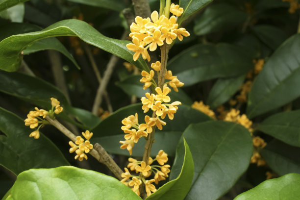 桂花是中國木犀屬眾多樹木的習稱,代表物種木犀,又名巖桂,系木犀科常綠灌木或小喬木,質(zhì)堅皮薄,葉長橢圓形面端尖,對生,經(jīng)冬不凋?;ㄉ~腑間,花冠合瓣四裂,形小,其園藝品種繁多,最具代表性的有金