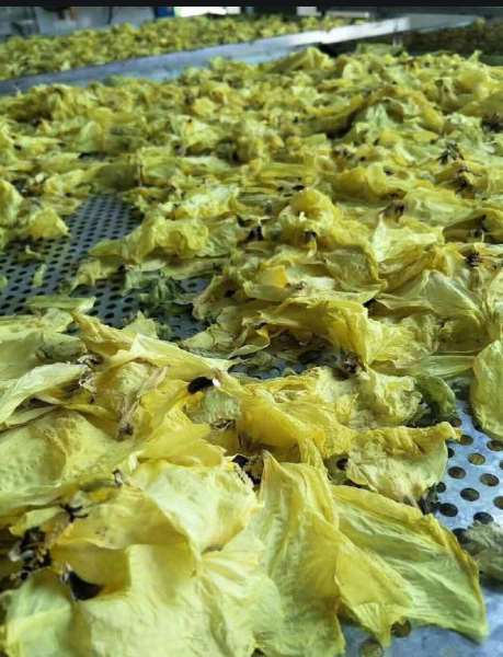 采摘回的金花葵,去除雜物和不符合標(biāo)準(zhǔn)的花朵或花碑, 在室內(nèi)進行攤晾,準(zhǔn)備殺青??梢允浅村伕邷貧⑶?,也可直接使用烘干機殺青。殺青是很多農(nóng)作物干燥的一個重要環(huán)節(jié),-方面,殺青可以通過高溫消滅細菌,另一方面,殺青能促成營養(yǎng)成分或芳香氣味和良好色澤的生成。