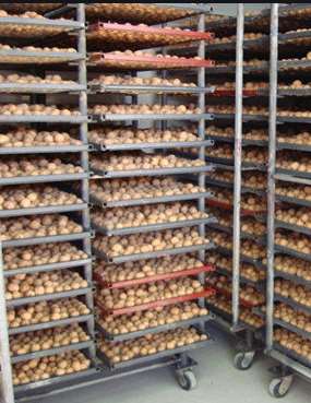 1臺10p熱泵主機,在無風(fēng)阻的情況下,每小時可產(chǎn)生4000m3左右的冷風(fēng)(夏季溫度在20-25℃),可供辦公室及車間降溫使用,烘干過程有整果烘干和去殼烘干的不同產(chǎn)品加工要求,烘干兩種類型的產(chǎn)品,溫度控制不一樣,帶果皮的烘干溫度可以調(diào)高一些,達到60℃即可,純果肉的在50℃即可,烘干后段都需要把溫度降低到45℃進行烘制,烘干過程中無需翻動,可以無人值守,帶果皮的一般需要30小時,純果肉的烘干一般18小時即可完成。