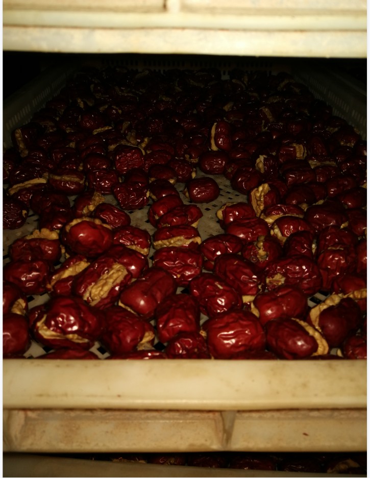 排濕階段我們把烘干機(jī)的溫度升溫到55攝氏度,時(shí)間為10小時(shí),此時(shí)的紅棗脫水率為百分之70左右。