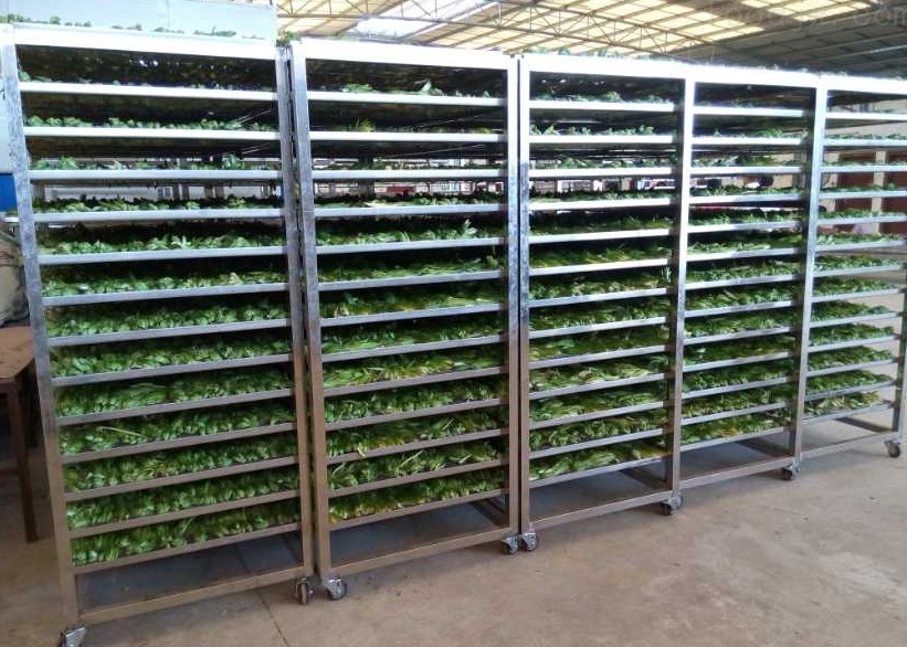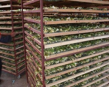 我們將采摘整理好的霸王花均勻擺放在霸王花烘干機物料車架上,初始烘干房溫度提高到55℃的范圍的前提下,方可將鮮花集中推入烘干房。干球設置為55℃,濕球設置為38℃的室溫保持4-6小時,4-6小時后為變軟期。