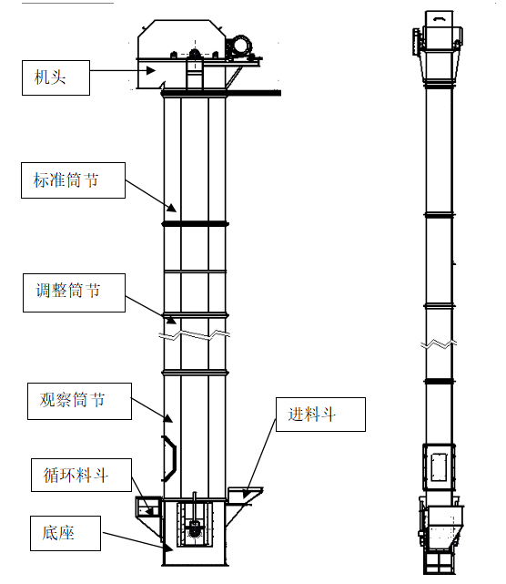 提升機(jī)由機(jī)座、機(jī)筒、機(jī)頭、畚斗、進(jìn)料口、畚斗帶及傳動(dòng)部分組成,如圖所示。護(hù)欄圈和工作平臺(tái)可根據(jù)需要來選擇配置使用。物料由進(jìn)料斗進(jìn)入提升機(jī)內(nèi),隨畚斗皮帶向上運(yùn)動(dòng),繞過頭輪后拋出,由出料口排出,進(jìn)入干燥塔內(nèi)。