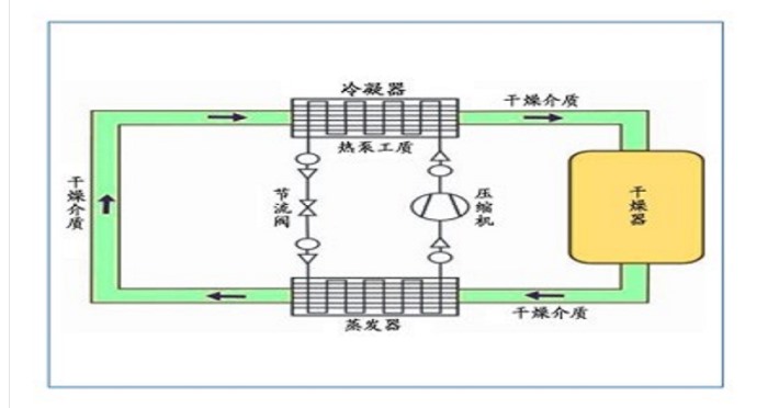 高溫?zé)岜煤娓蓹C(jī)組,主要由翅片式蒸發(fā)器(外機(jī))、壓縮機(jī)、翅片冷凝器(內(nèi)機(jī))和膨脹閥四部分組成,通過讓工質(zhì)不斷完成蒸發(fā)(吸取室外環(huán)境中的熱量)→壓縮→冷凝(在室內(nèi)烘干房中放出熱量)→節(jié)流→再蒸發(fā)的熱力循環(huán)過程,從而將外部低溫環(huán)境里的熱量轉(zhuǎn)移到烘干房中,冷媒在壓縮機(jī)的作用下在系統(tǒng)內(nèi)循環(huán)流動。它在壓縮機(jī)內(nèi)完成氣態(tài)的升壓升溫過程(溫度高達(dá)100℃),它進(jìn)入內(nèi)機(jī)釋放出高溫?zé)崃考訜岷娓煞績?nèi)空氣,同時自己被冷卻并轉(zhuǎn)化為流液態(tài),當(dāng)它運(yùn)行到外機(jī)后,液態(tài)迅速吸熱蒸發(fā)再次轉(zhuǎn)化為氣態(tài),同時溫度可下降到-20℃~-30℃,這時吸熱器周邊的空氣就會地將熱量傳遞給冷媒。