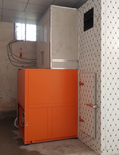 用菌烘干機(jī)主要由翅片式蒸發(fā)器(外機(jī))、壓縮機(jī)、翅片冷凝器(內(nèi)機(jī))和膨脹閥四部分組成,通過讓工質(zhì)不斷完成蒸發(fā)(吸取室外環(huán)境中的熱量)→壓縮→冷凝(在室內(nèi)烘干房中放出熱量)→節(jié)流→再蒸發(fā)的熱力循環(huán)過程,從而將外部低溫環(huán)境里的熱量轉(zhuǎn)移到烘干房中,冷媒在壓縮機(jī)的作用下在系統(tǒng)內(nèi)循環(huán)流動(dòng)。