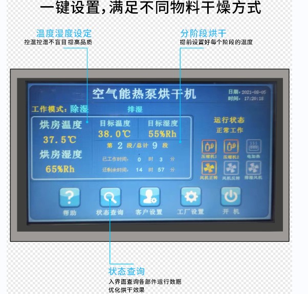 烘干溫度是出風(fēng)溫度還是烘干房的溫度?烘干的物料是不是必須要這么高的溫度?如果需要80℃或者90℃的高溫,是全程都需要這么高的溫度還是某一個(gè)時(shí)間段?只有弄清楚這些問題,才能更好地解決熱泵烘干過程中遇到的問題。