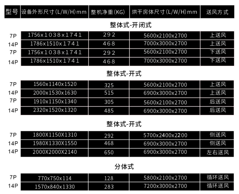 (3) 烘干的的大小,配上合適的烤房。根據(jù)烘干機(jī)設(shè)備的匹數(shù)大小來設(shè)定,如果我們的烘干機(jī)設(shè)備大小與烤房的大小不合適的話,那么我們的烘干機(jī)設(shè)備在烘干的時(shí)候,烘干效率是不高的,如下圖是我們常用的配套參數(shù)。