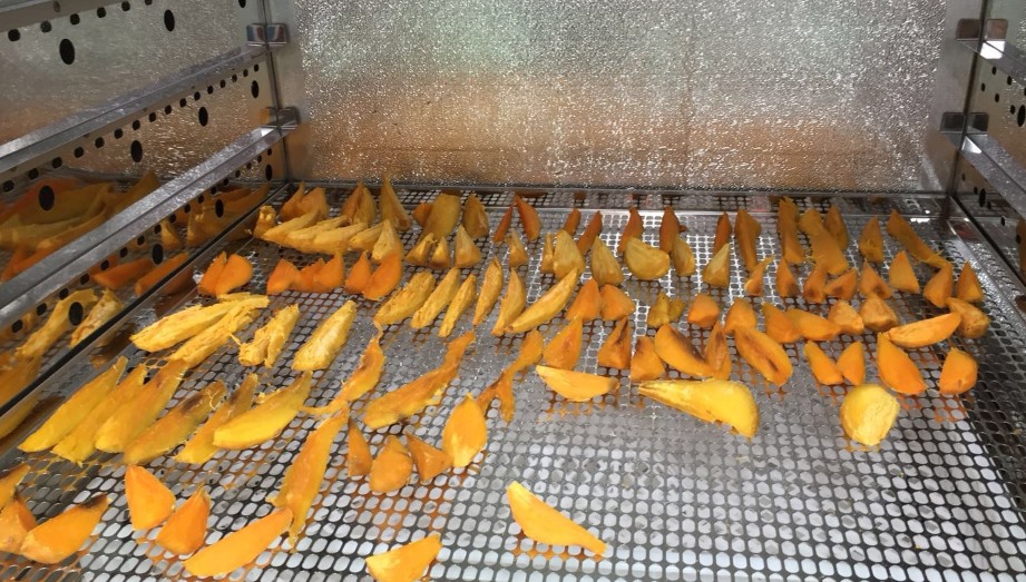 進(jìn)入第四段,目標(biāo)溫度設(shè)定到70℃,烘干時(shí)間設(shè)定2小時(shí),進(jìn)行連續(xù)c濕,Z終紅薯片的濕度保持在18%,烘干即可完成。停機(jī)后,讓紅薯片自然冷卻。