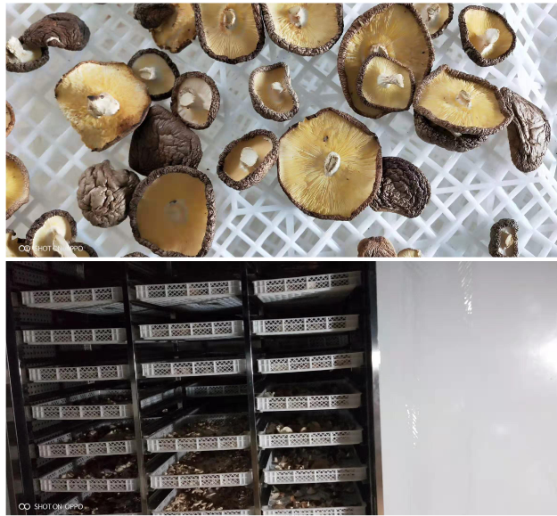 2、恒速干燥階段:二階段我們設(shè)置烘干的溫度為我們的40~50溫度左右,烘干的時間在10~12個小時,這個階段食用菌隨著時間加長,體內(nèi)水分的蒸發(fā)、硬化由菌傘邊開始,向內(nèi)部肉厚部分推移。