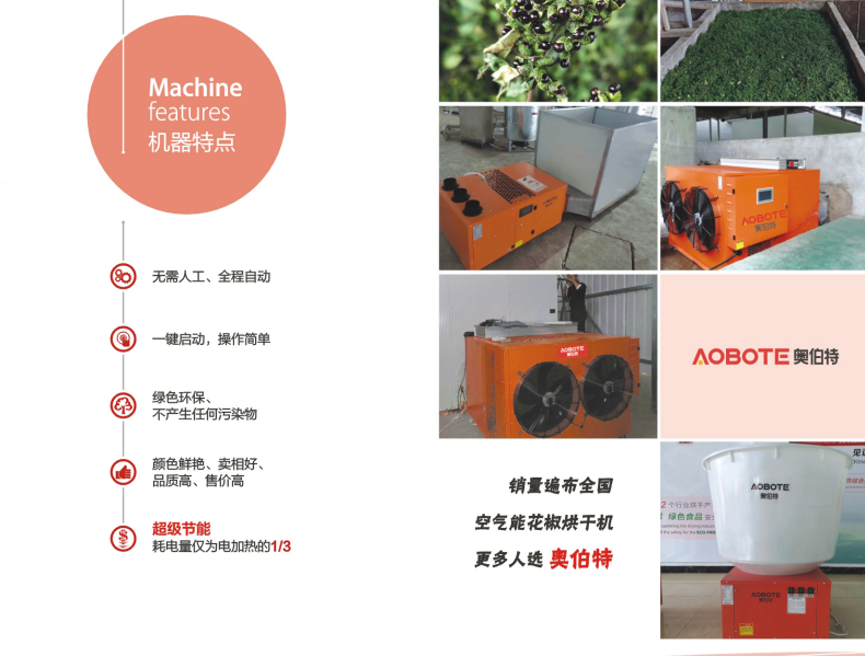 廣東奧伯特花椒生產(chǎn)廠家,它是一家專門生產(chǎn)我們花椒烘干機(jī)設(shè)備的生產(chǎn)廠家,生產(chǎn)的類型也是比較多的,大到我們商用的一個(gè)25p的花椒烘干機(jī)設(shè)備,小到我們家用的花椒烘干機(jī)設(shè)備,特別是我們的家用烘干機(jī)設(shè)備,1.5P花椒烘干機(jī),這種小型家用的花椒烘干機(jī)設(shè)備,使用的普遍性是比較高的,比如說我們的云南、貴州之類的使用的比較多。