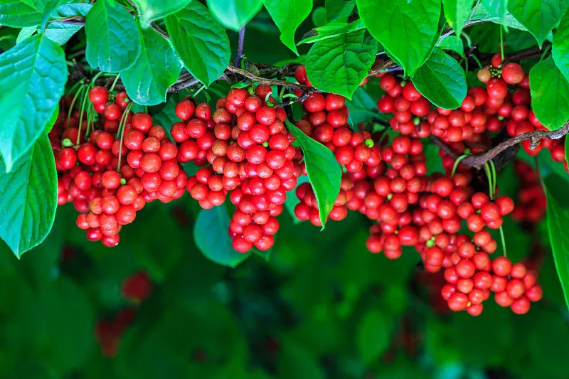 五味子呈不規(guī)則的球形或扁球形,直徑5~8毫米。表面紅色、紫紅色或暗紅色,皺縮,顯油潤;有的表面呈黑紅色或出現(xiàn)“白霜”。果肉柔軟,種子1~2,腎形,表面棕黃色,有光澤,種皮薄而脆。果肉氣微,味酸,種子破碎后,有香氣,味辛、微苦。