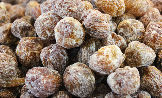 當(dāng)原料變軟且表面出現(xiàn)細(xì)紋時,開始在煮棗液中加入干糖。邊煮沸邊加入干糖,共分6次進(jìn)行。頭3次以每0.5公斤原料加干糖50克的同時,加入煮棗糖液15克(煮棗糖液循環(huán)使用),第4、5次以每0.5公斤原料加干糖80克,同時加入煮棗糖液15克,第6次以每0.5公斤原料加干糖100克,糖液煮沸20分鐘后,蜜棗呈半透明、糖液可溶性固形物70%左右時,蜜制過程結(jié)束。