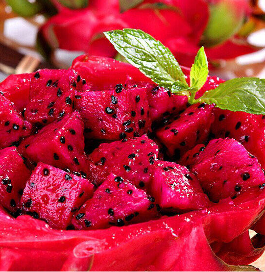 火龍果是仙人掌科,攀援肉質(zhì)灌木,具氣根。分枝多數(shù),延伸,葉片棱常翅狀,邊緣波狀或圓齒狀,深綠色至淡藍(lán)綠色,骨質(zhì),花漏斗狀,于夜間開放,鱗片卵狀披針形至披針形,薯狀花被片黃綠色,線形至線狀披針形,瓣?duì)罨ū黄咨L圓狀倒披針形,花絲黃白色,花柱黃白色,漿果紅色,長球形,果臍小,果肉白色、紅色。種子倒卵形,黑色,種臍小。7-12月開花結(jié)果。