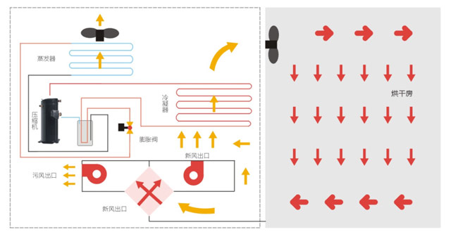 利用冷媒經(jīng)過壓縮機(jī)壓縮,成為高溫高壓的氣體,進(jìn)入冷凝器放熱,冷凝放熱出的熱量由循環(huán)風(fēng)機(jī)送入烤房,將烤房空氣加熱(最高可達(dá)75℃)。隨之空氣溫度升高,烘干物中的水分會逐漸蒸發(fā),再由新風(fēng)排濕系統(tǒng)進(jìn)行排濕,從而達(dá)到烘干的效果。