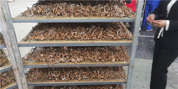 隨著菇體內(nèi)水分的蒸發(fā),烘房內(nèi)通風不暢會造成濕度升高,導致色澤灰褐、品質下降。操作要求:第1-8小時打開全部排濕窗,第8-12小時通風量保持50%左右,第10-15小時通風量保持30%,第16小時后,菇體已基本干燥,可關閉排濕窗。