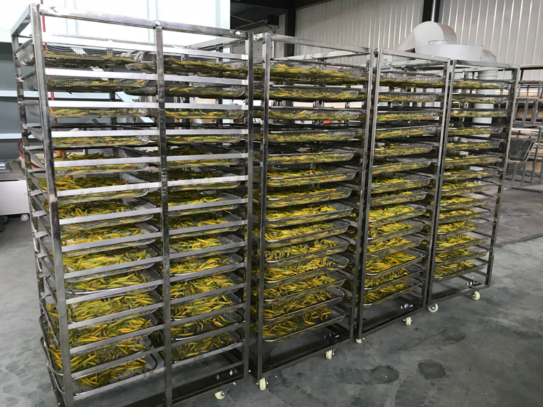黃花菜烘干工藝:將烘盤(黃花菜5千克/平方米)放入80℃的烘房中,由于黃花菜大量吸熱,烘房溫度會降至60℃-65℃,保持此溫度10-12小時,然后自然降溫至50℃,直至烘干為止。烘干期間注意排濕,保持65%以下的相對濕度。脫水后的黃花菜用手握緊不發(fā)脆,松手后又能自然散開,以相互之間不粘連為宜。如果再將干燥的黃花菜略曬,可改善色澤。