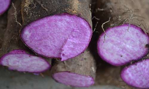 紫玉淮山外觀粗長(zhǎng),長(zhǎng)度100厘米左右,胸徑約6厘米。肉質(zhì)紫紅色,口感佳。營養(yǎng)豐富,含有淀粉、多糖、蛋白質(zhì)、皂甙、淀粉酶、膽堿、氨基酸、維生素、鈣、鐵、鋅等20多種營養(yǎng)素。根據(jù)農(nóng)業(yè)部蔬菜水果質(zhì)量監(jiān)督檢驗(yàn)測(cè)試中心(廣州)的檢驗(yàn)測(cè)定,紫玉淮山含有成分為:淀粉23.3%,水分75.5%,粗蛋白1.14%,總糖0.62%,粗脂肪0.20%,鐵2.59mg/kg,鋅2.27mg/kg,銅0.753 mg/kg;其中紫玉淮山的花青素含量是白淮山的60倍,對(duì)人的眼睛有保健作用,還含有人參的主要成分“皂苷”等。